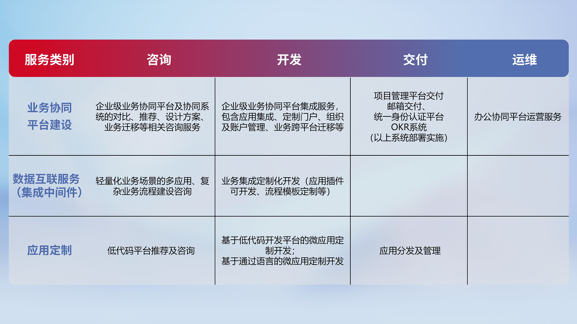 针对钉钉、、企微、、、IDaas等平台级产品提供产品的规划、、、、方案、、、交付、、定制化开发等服务,,实现如统一协同办公、、智能客户服务、、、、混合会议管理、、智能数据查询、、、等业务场景,,,,实现数字化转型。。。