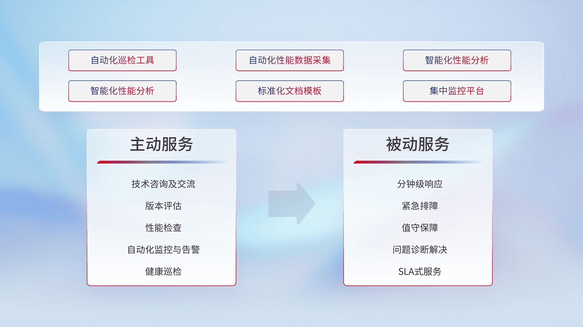 智能化工具和标准化文档,,,,保障服务质量,,提供主动服务(包含技术咨询、、版本评估、、性能检查、、、自动化监控与告警、、、健康巡检)和被动服务包含(分钟级响应、、紧急排障、、、值守保障、、问题诊断解决、、、SLA服务)。。